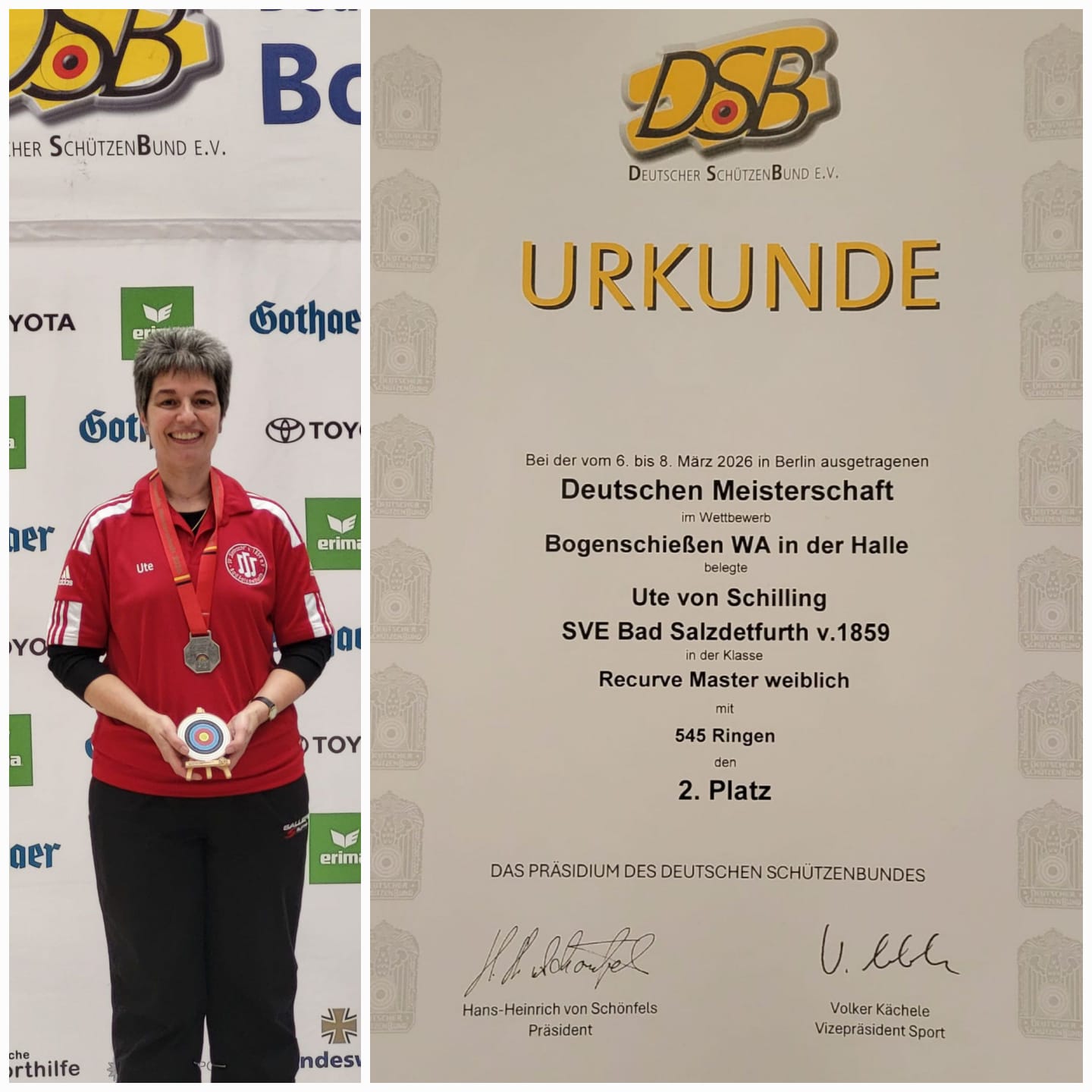 Dr. Ute von Schilling von der SV Eintracht Bad Salzdetfurth ging bei der Deutschen Meisterschaft „Bogenschießen WA Halle“ 2026 des Deutschen Schützenbundes (DSB) in Berlin an den Start. Zu den Deutschen Meisterschaften hatten sich ca. 570 Bogenschützen qualifiziert, in 3 Durchgängen wurden die Meister in den jeweiligen Alters- und Bogenklassen ermittelt. Geschossen wurden 2 x 30 Pfeile auf eine Distanz von 18 m, in der Klasse Recurve Master weiblich auf eine Dreierspot-Auflage mit 20 cm Durchmesser mit der Wertung 10,9,8,7 und 6 Ringen. Dr. Ute von Schilling wurde in dieser Klasse Deutsche Vizemeisterin mit 545 Ringen.